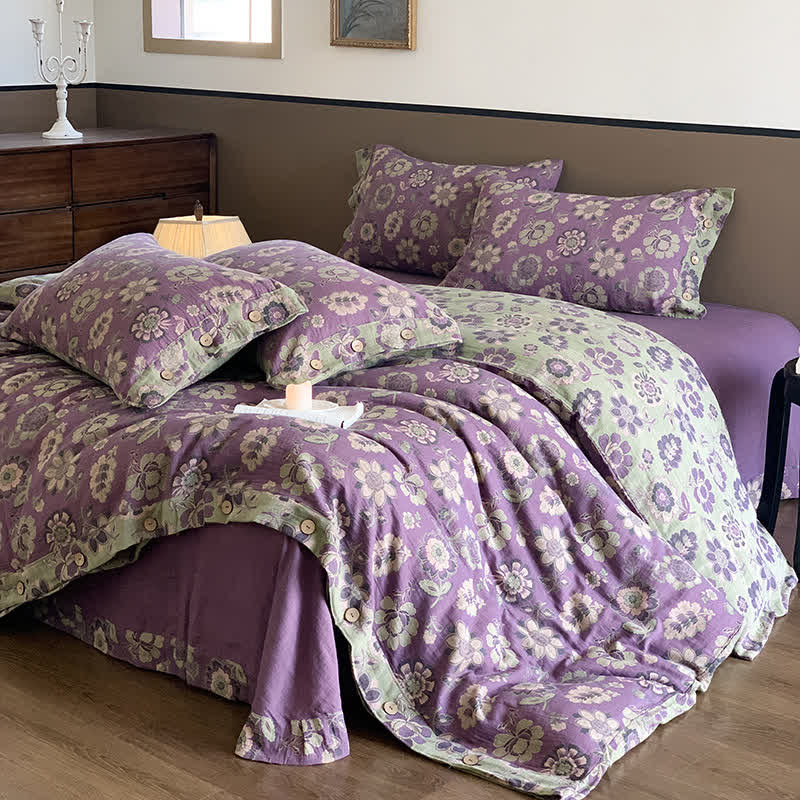 Bettwäscheset mit Knöpfen und Blumenmuster aus Baumwollgaze (4-teilig)
