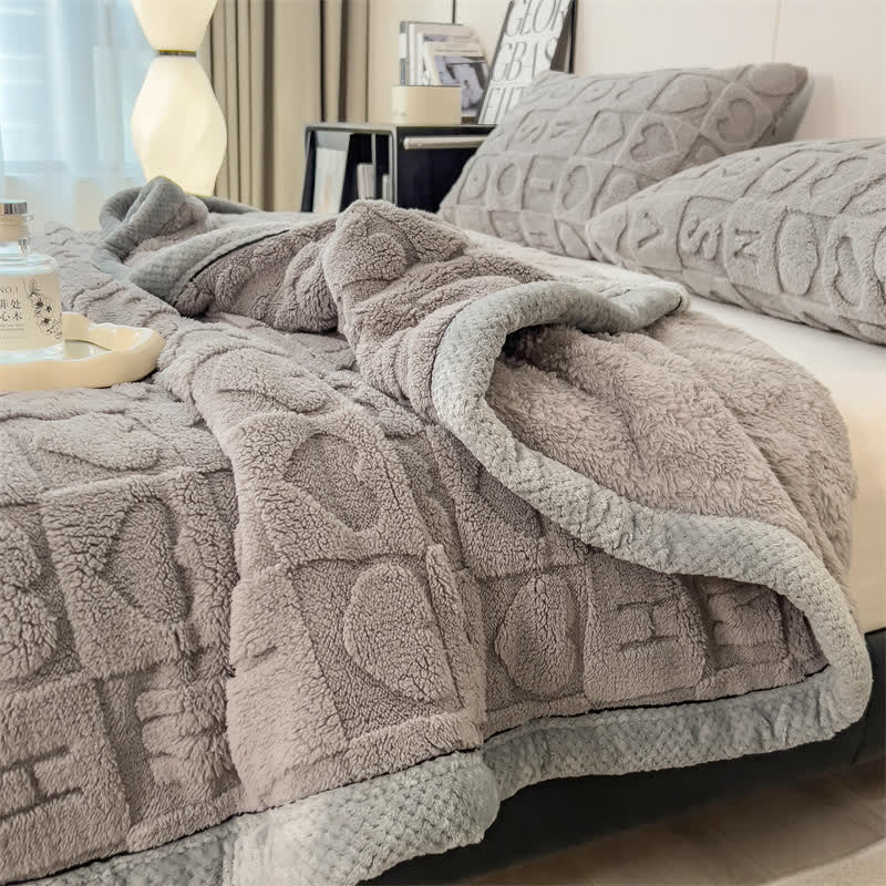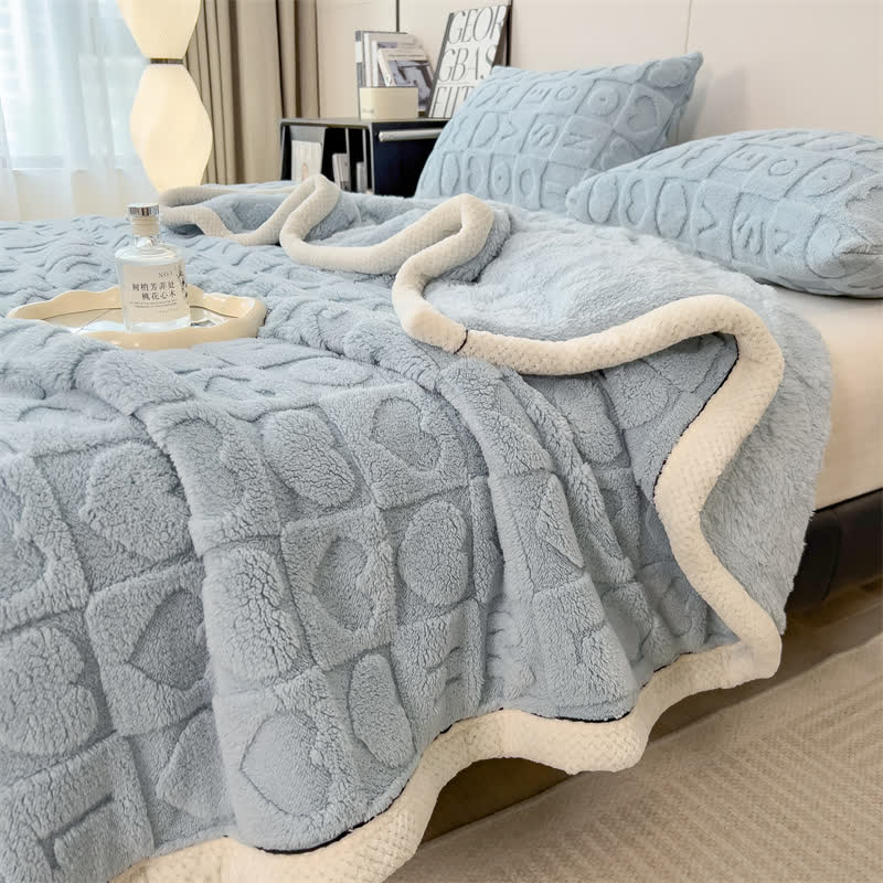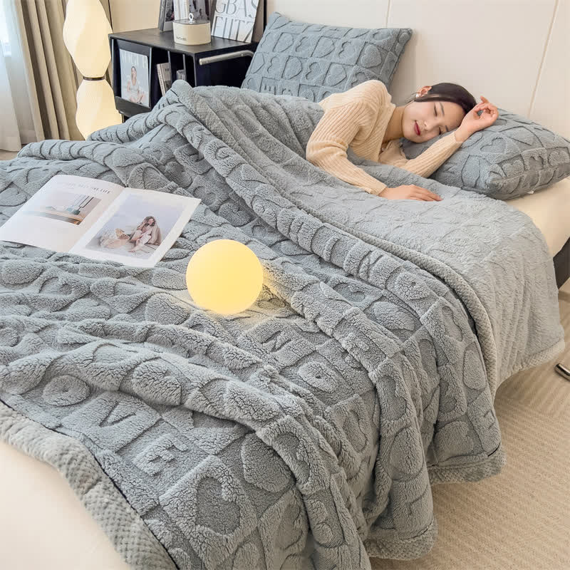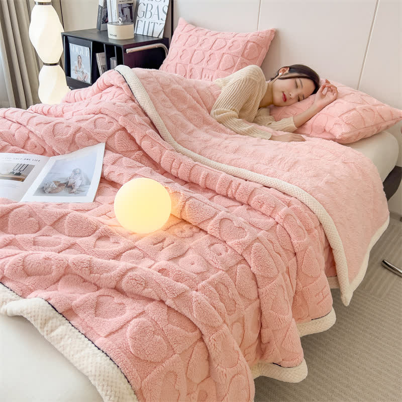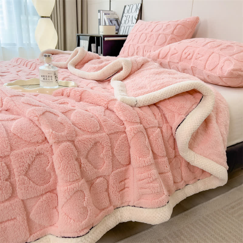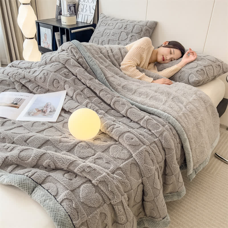 Das markante herzförmige Muster schafft eine gemütliche Atmosphäre, die schlicht und stilvoll ist, sich nahtlos in verschiedene Einrichtungsstile einfügt und Kinder und Erwachsene gleichermaßen anspricht. Der hochwertige Plüschstoff bietet eine glatte Textur, die die Haut sanft pflegt und gleichzeitig ein wohliges Wärmegefühl vermittelt.