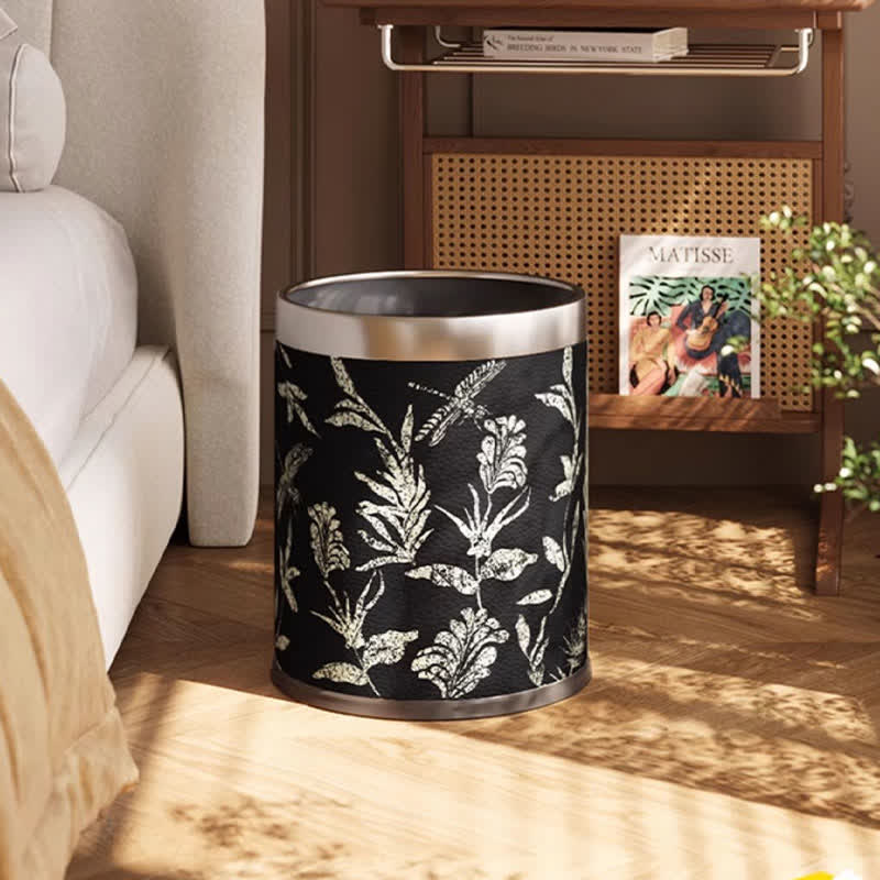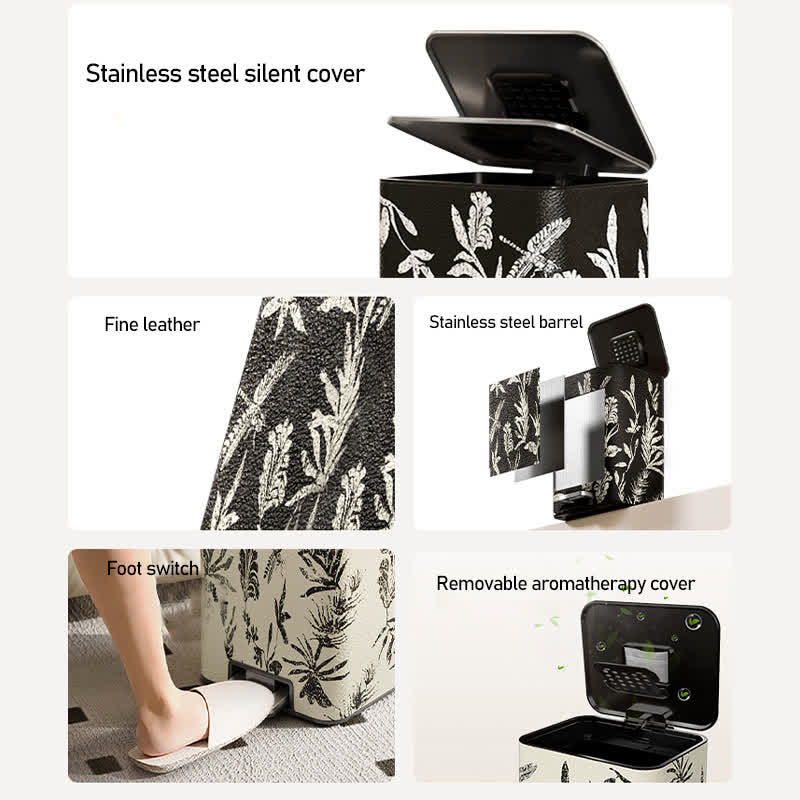 Dieser Mülleimer verfügt über ein doppellagiges Design mit Innen- und Außeneimern, wodurch der Müllbeutel verborgen bleibt und Ästhetik und Funktionalität vereint. Erhältlich in verschiedenen Größen und Ausführungen für unterschiedliche Bedürfnisse, besteht er aus hochwertigem Leder und verstärkten Materialien und bietet eine edle Haptik. Der sorgfältig gestaltete rutschfeste Boden sorgt für sicheren Stand.