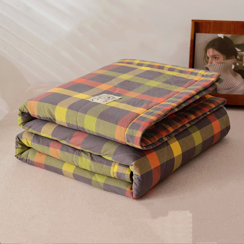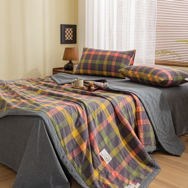 Garngefärbte karierte Vintage-Bettwäsche aus reiner Baumwolle