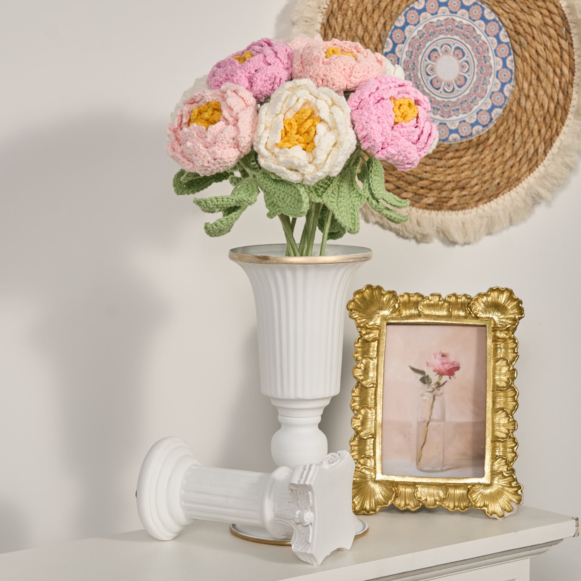 Perfekt für Liebhaber kunstvoller und umweltfreundlicher Dekoration. Dieser gestrickte Blumenstrauß verschönert jeden Wohnraum und hinterlässt einen bleibenden Eindruck. Mit leuchtenden Farben und raffinierten Texturen dient er als zeitloser Blickfang für Tische, Regale oder Kaminsimse. Dieser handgefertigte Strauß eignet sich auch hervorragend als Geschenk zur Einweihung, zum Geburtstag oder zu anderen besonderen Anlässen und bietet eine liebevolle Möglichkeit, Freude und Kreativität mit Ihren Lieben zu teilen.