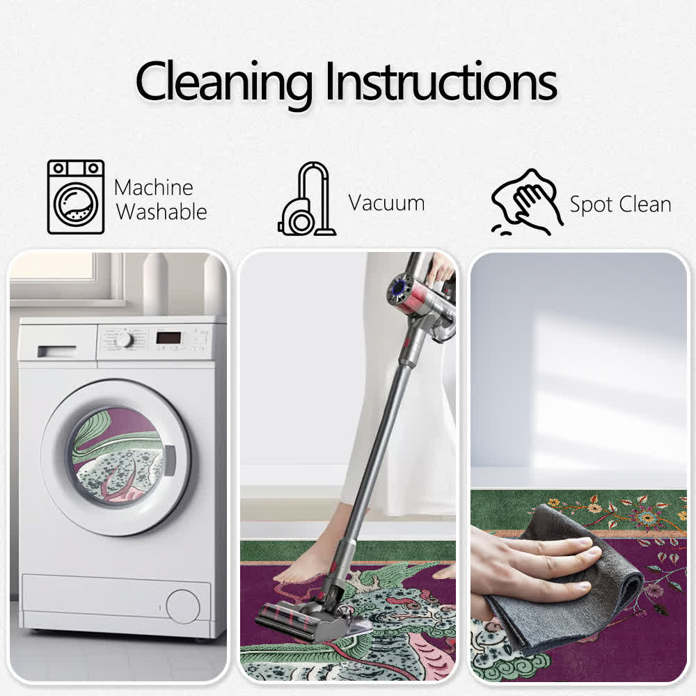 Dieser Teppich besteht aus weichen, hautfreundlichen Materialien und sorgt für ein angenehmes Fußgefühl. Verschüttete Flüssigkeiten und Flecken sind kein Problem! Einfach in die Waschmaschine werfen und problemlos reinigen. Das raffinierte Kirin-Motiv und die Vintage-inspirierten Farben passen sowohl zu modernen als auch zu klassischen Interieurs.