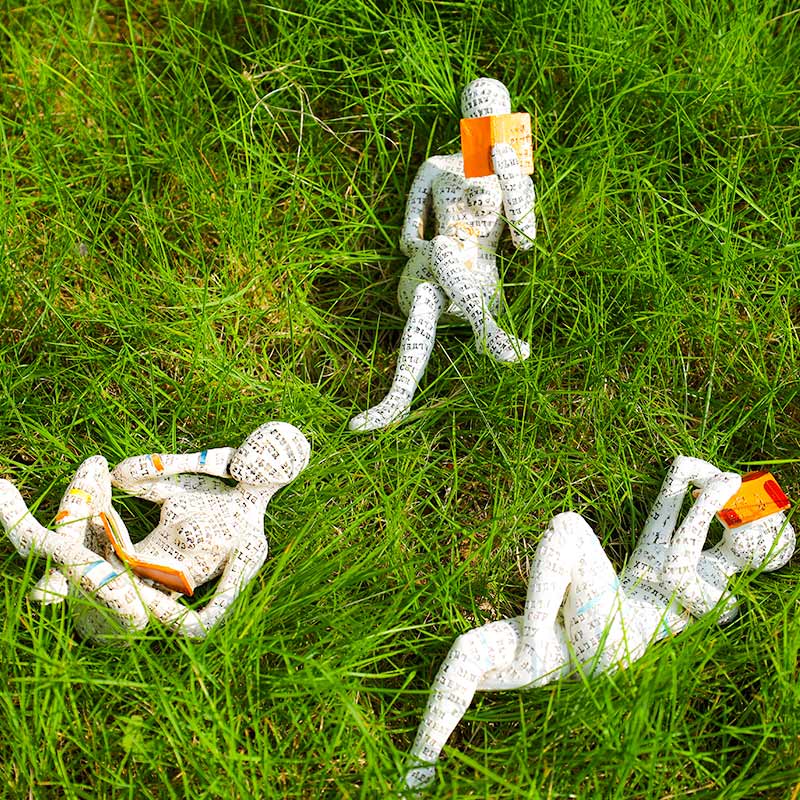 Pulp-Woman-Leseskulptur: Frau, eingehüllt in Buchseiten-Design und der einzigartige Denkerstil ziehen jedermanns Aufmerksamkeit auf sich, verleihen ungewöhnlichen Geschmack und zeigen Individualität.