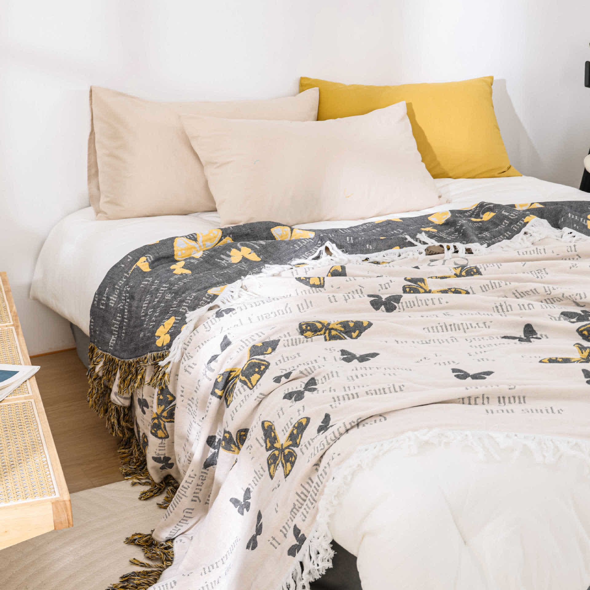 Diese hochwertige Baumwolldecke mit lebendigen Schmetterlingsmotiven bietet luxuriösen Komfort. Sie ist leicht, atmungsaktiv, feuchtigkeitsabsorbierend und pillingresistent. Sie ist leicht zu waschen und schnelltrocknend und somit besonders pflegeleicht.