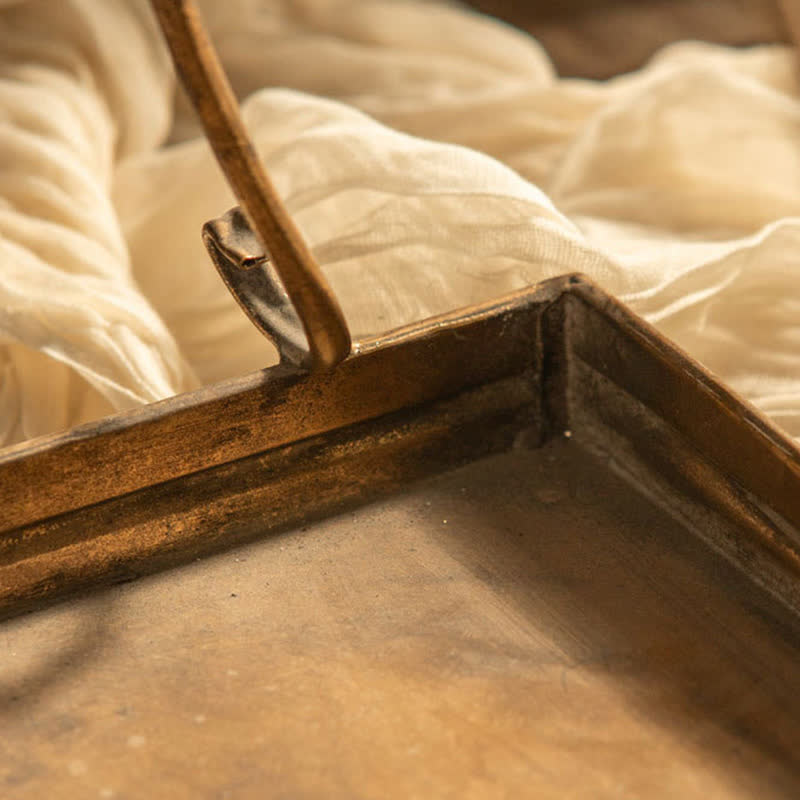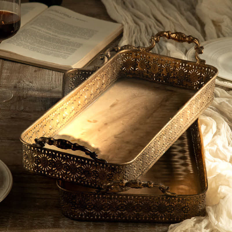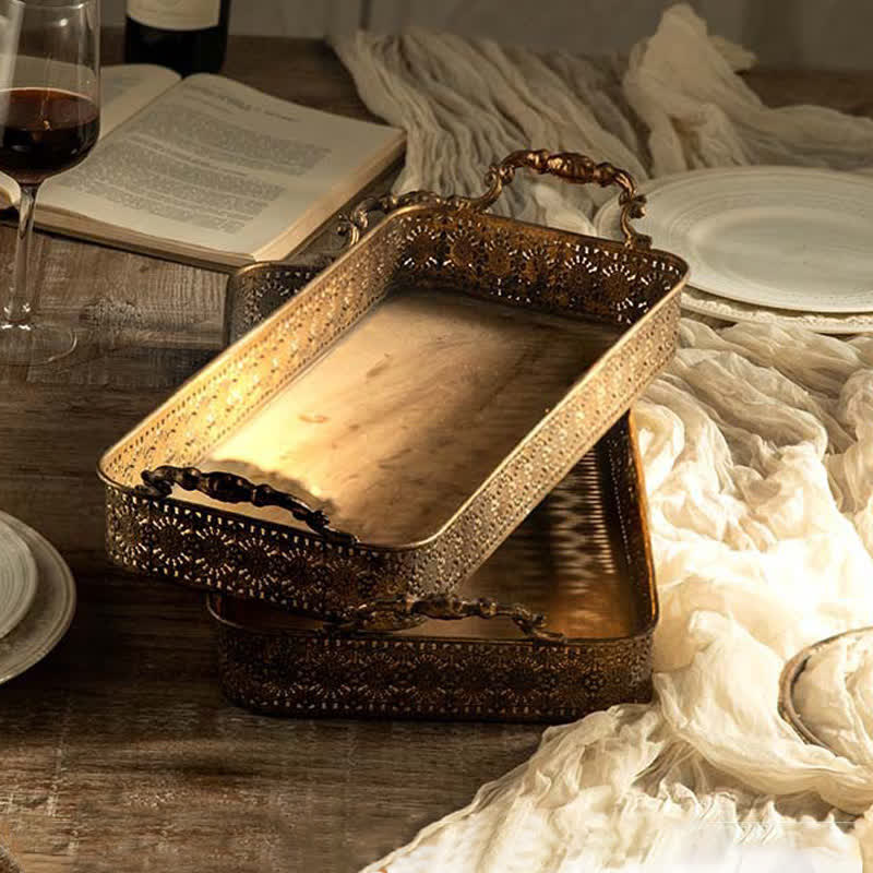 Das Tablett besticht durch traditionelle Eisenkunst im Antik-Look und einen einzigartigen Retro-Stil, der sich harmonisch in verschiedene Wohnstile einfügt. Es bietet Platz für frisches Brot, Obst oder kleine Gegenstände und deckt den täglichen Bedarf. Sein unverwechselbares Aussehen macht es zu einem hervorragenden Requisit für künstlerische Food-Fotografie.