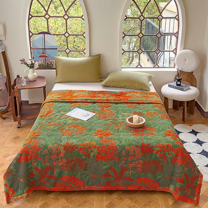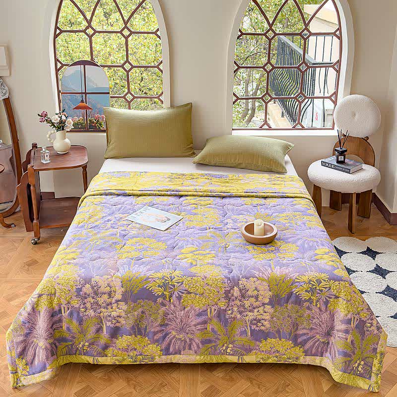 Diese leichte Steppdecke aus weicher, atmungsaktiver reiner Baumwolle besticht durch einen lebendigen tropischen Vintage-Print und ein komfortables, doppellagiges Gaze-Design. Ideal für den Sommer, bringt sie kühlen Komfort und einen Hauch von Retro-Inselcharme in Ihr Schlafzimmer.