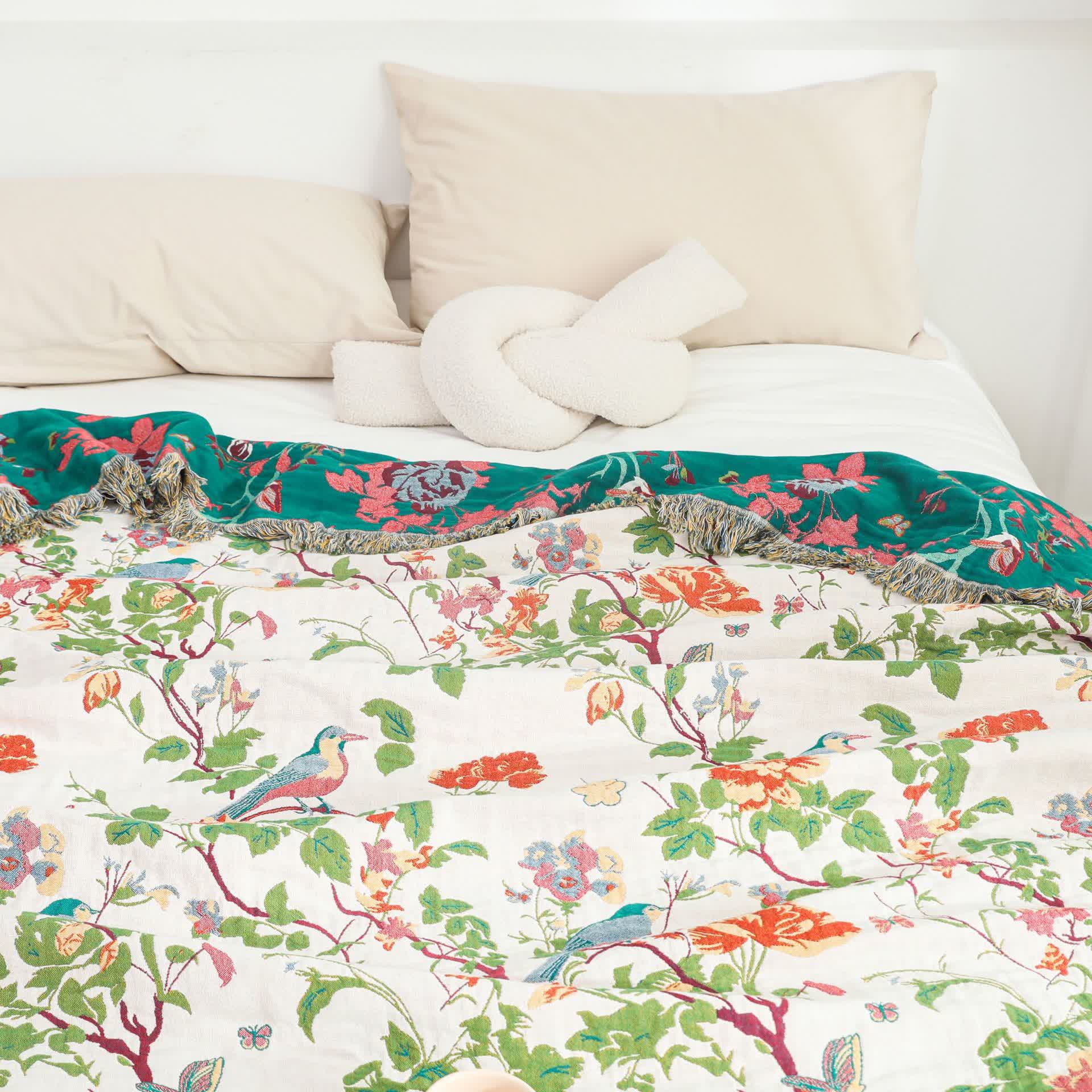 Wendesteppdecke aus Baumwollgaze mit Pfingstrosen und Vögeln